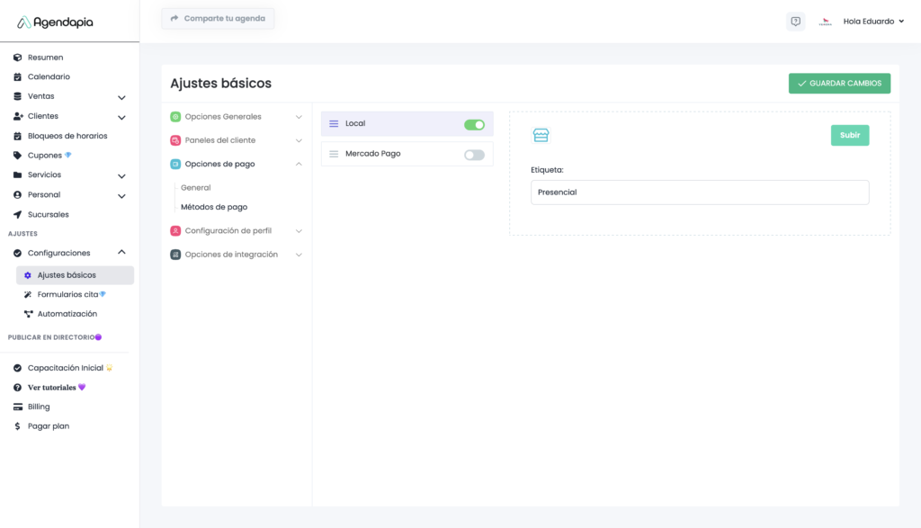 Configuraciones → Ajustes Básicos → Opciones de pago → Métodos de pago → Activar Local