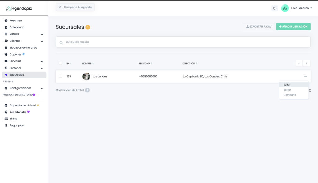 Normalmente cuando creas una cuenta en Agendapia, se agrega una sucursal por defecto de acuerdo a tu plantilla elegida, la idea es que uses esa misma sucursal, y solo edites los datos. Para eso simplemente ingresa a Sucursales, y haz click en la sucursal existente, en los 3 puntitos para editar.