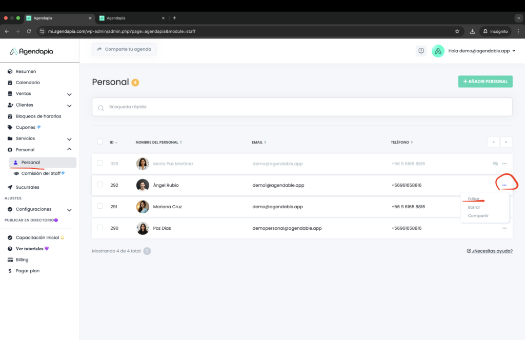 Si necesitas bloquear días completos de un personal, deberás usar el módulo de Vacaciones del personal. Esta opción bloquea días completos. Al marcar una fecha como vacaciones, el profesional no tendrá disponibilidad durante todo ese día. Es la opción correcta para vacaciones, licencias médicas o ausencias prolongadas.