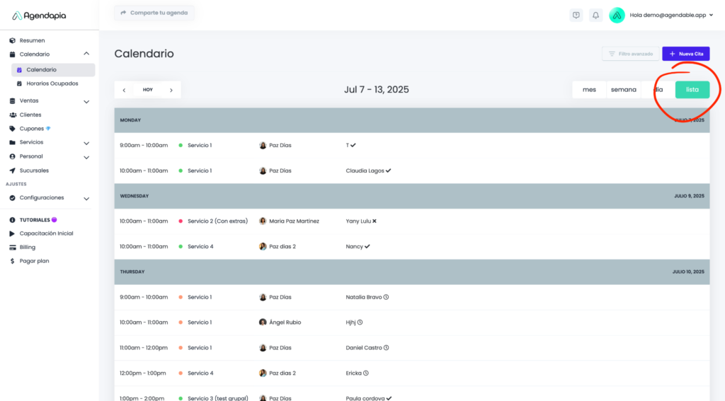 - Vista de Lista: Presenta las citas en un formato de listado estructurado para una lectura rápida.