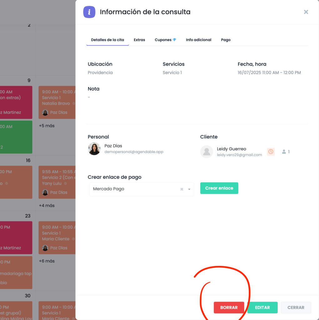 - Eliminar una cita: Selecciona la cita, haz clic en "Borrar" y confirma la acción para removerla definitivamente del sistema.