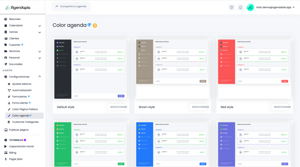 Agendapia tiene algunas plantillas por defecto. Para aplicarlo, selecciona el color que más te guste y haz clic en el botón para activarlo instantáneamente.
