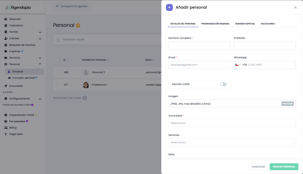 - Si no agregas personal, no se podrán asignar servicios ni recibir reservas.