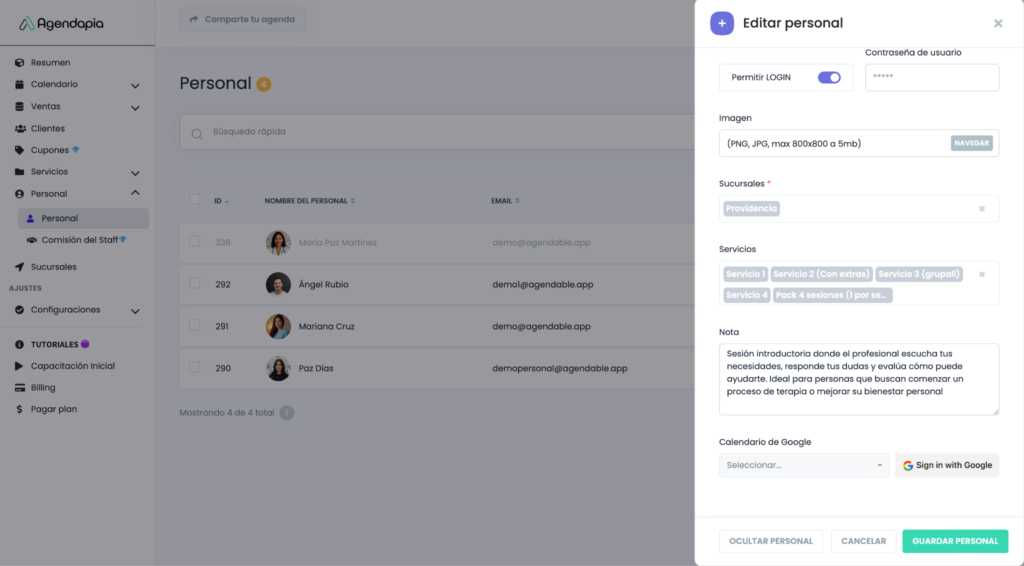 Para usar Google Calendar, la cuenta administradora debe habilitarlo a nivel general, luego cada personal, debe iniciar sesión en su cuenta y conectar su google calendar personal.