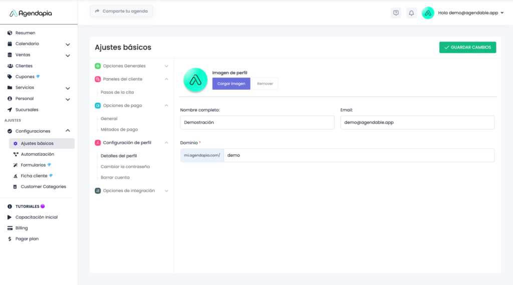 La Configuración de perfil te permite administrar los datos básicos de tu cuenta en Agendapia, como tu información personal, el enlace de tu agenda y la seguridad de acceso.