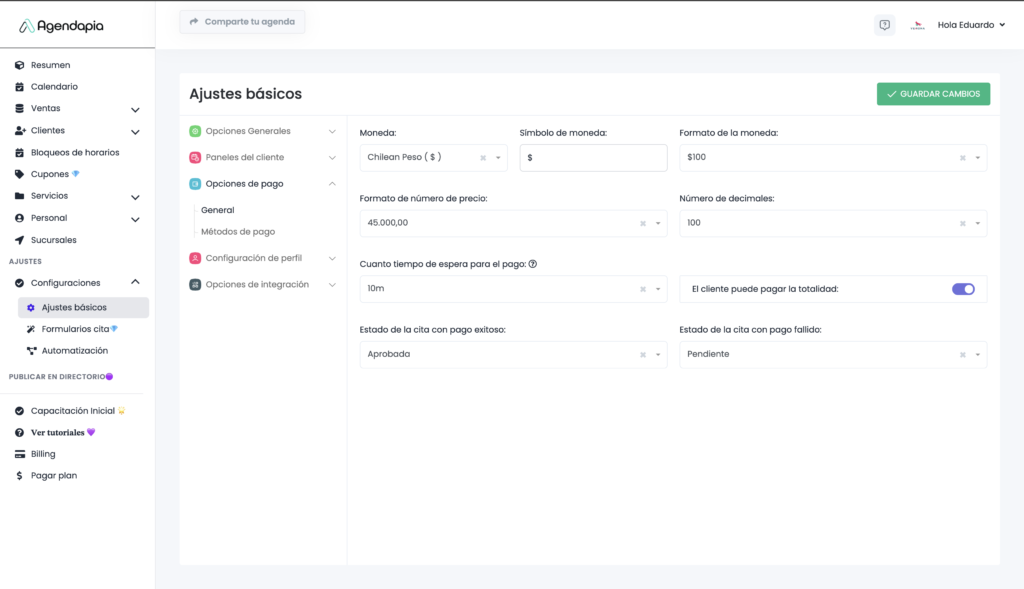 Configuraciones → Ajustes Básicos → Opciones de pago → General