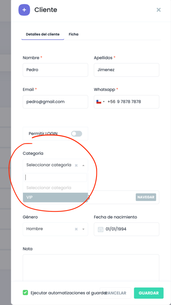 Si accedes desde el módulo de calendario, simplemente haz click en la cita y donde dice cliente presiona para ver su información. Podrás ver nombre, apellido, correo, whatsapp, género, fecha de nacimiento y notas. Esto es la ficha básica. Si deseas además puedes solicitar otros campos a nivel de ficha del cliente con el módulo premium: ficha avanzada del cliente.