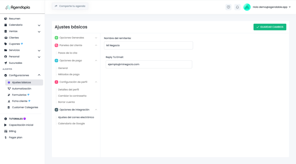 En Agendapia, puedes personalizar el Nombre del Remitente para los correos automatizados, eligiendo cómo deseas que aparezca (por defecto es "Agendapia"), puedes colocar el Nombre de tu negocio. Además, en el campo Reply To Email, puedes colocar tu propio correo. De esta forma, si un cliente responde a un correo automatizado, la respuesta llegará directamente a tu bandeja de entrada. Si no colocas tu correo en este campo, las respuestas no se recibirán, ya que son correos generados automáticamente. Este es una funcionalidad premium.