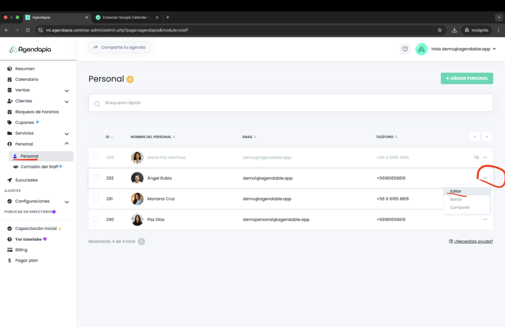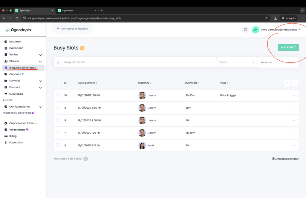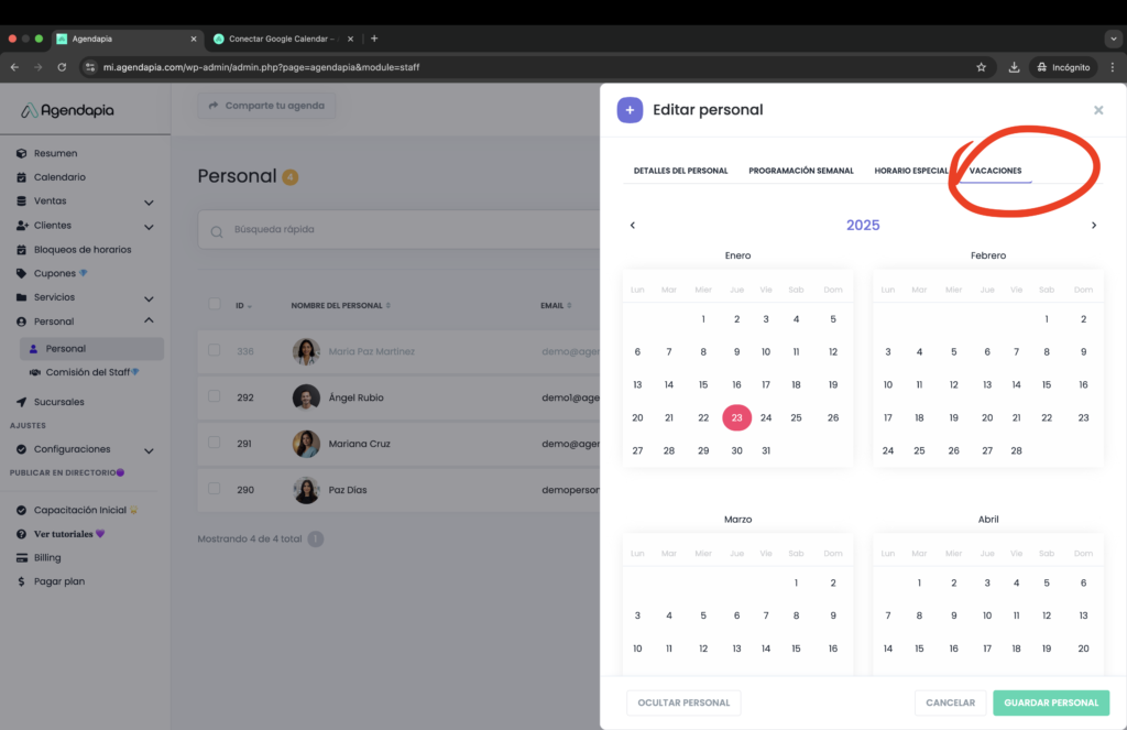 Si necesitas bloquear días completos de un personal, deberás usar el módulo de Vacaciones del personal. Esta opción bloquea días completos. Al marcar una fecha como vacaciones, el profesional no tendrá disponibilidad durante todo ese día. Es la opción correcta para vacaciones, licencias médicas o ausencias prolongadas.