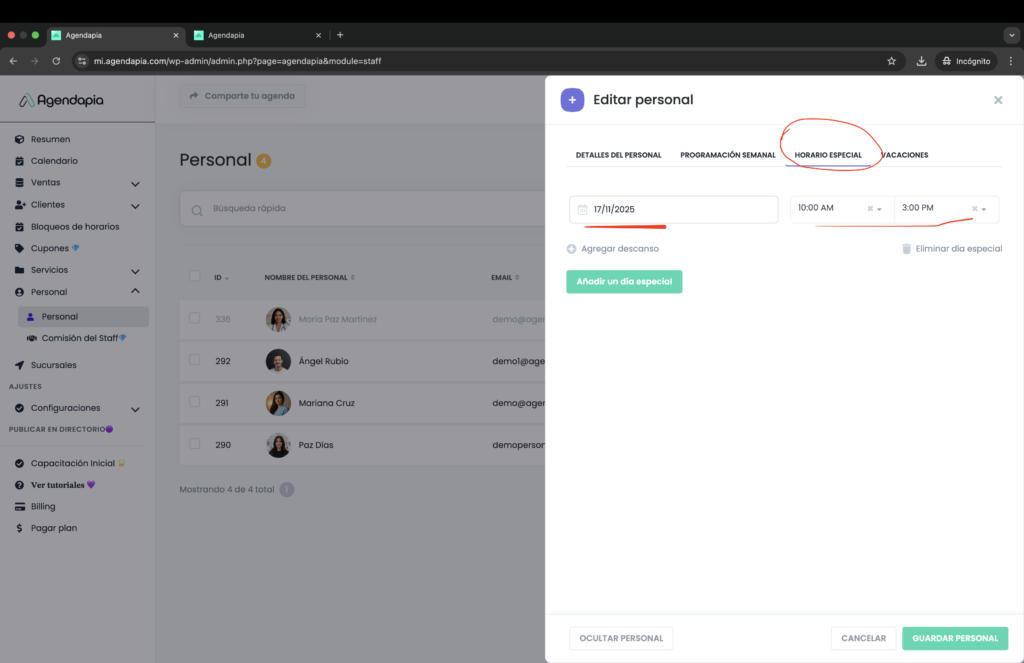 Personal → Tres puntos del profesional → Editar → Pestaña “Horario especial”