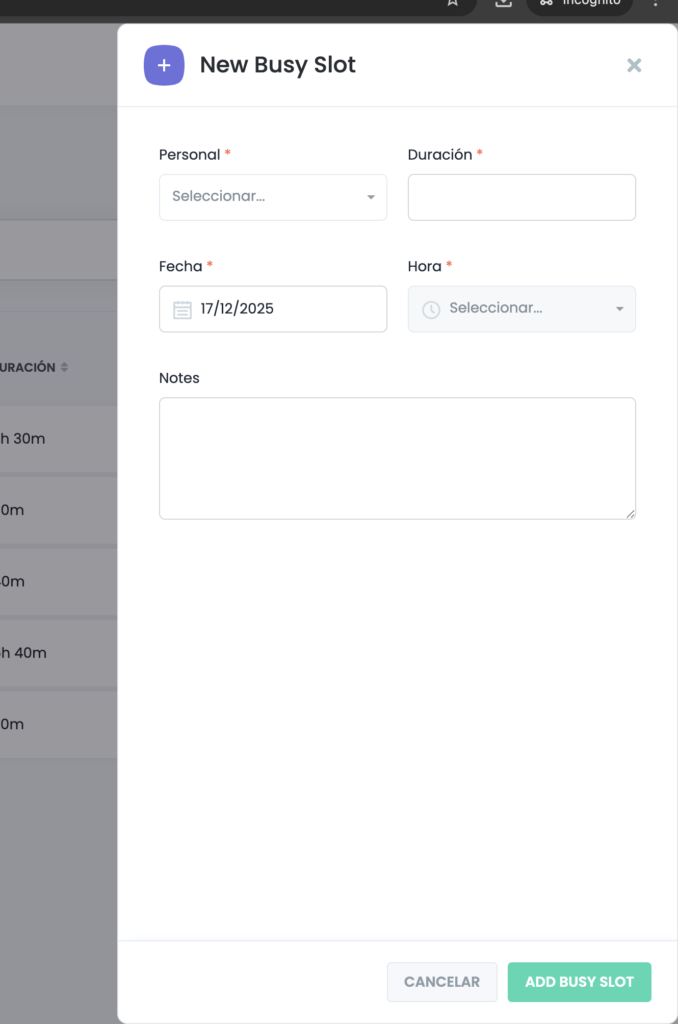 Este módulo permite bloquear horarios específicos sin cambiar el horario normal del profesional. Indicas el profesional, la fecha y la duración del bloqueo (en minutos), y ese tramo deja de estar disponible en la agenda. Es ideal para reuniones, trámites o pausas puntuales.