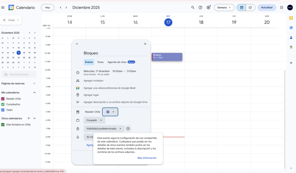 Si el profesional tiene su Google Calendar conectado, cualquier horario marcado como ocupado en Google Calendar se bloqueará automáticamente en Agendapia. Esta opción es útil para quienes ya gestionan su agenda diaria desde Google Calendar y no quieren configurar bloqueos manuales en la plataforma. Tutorial para conectar google calendar: https://agendapia.com/tutoriales/conectar-google-calendar/