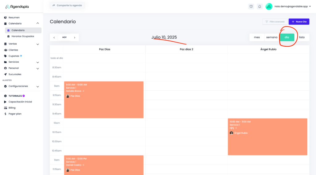Filtro por Personal: Filtra para ver la agenda de un solo colaborador.