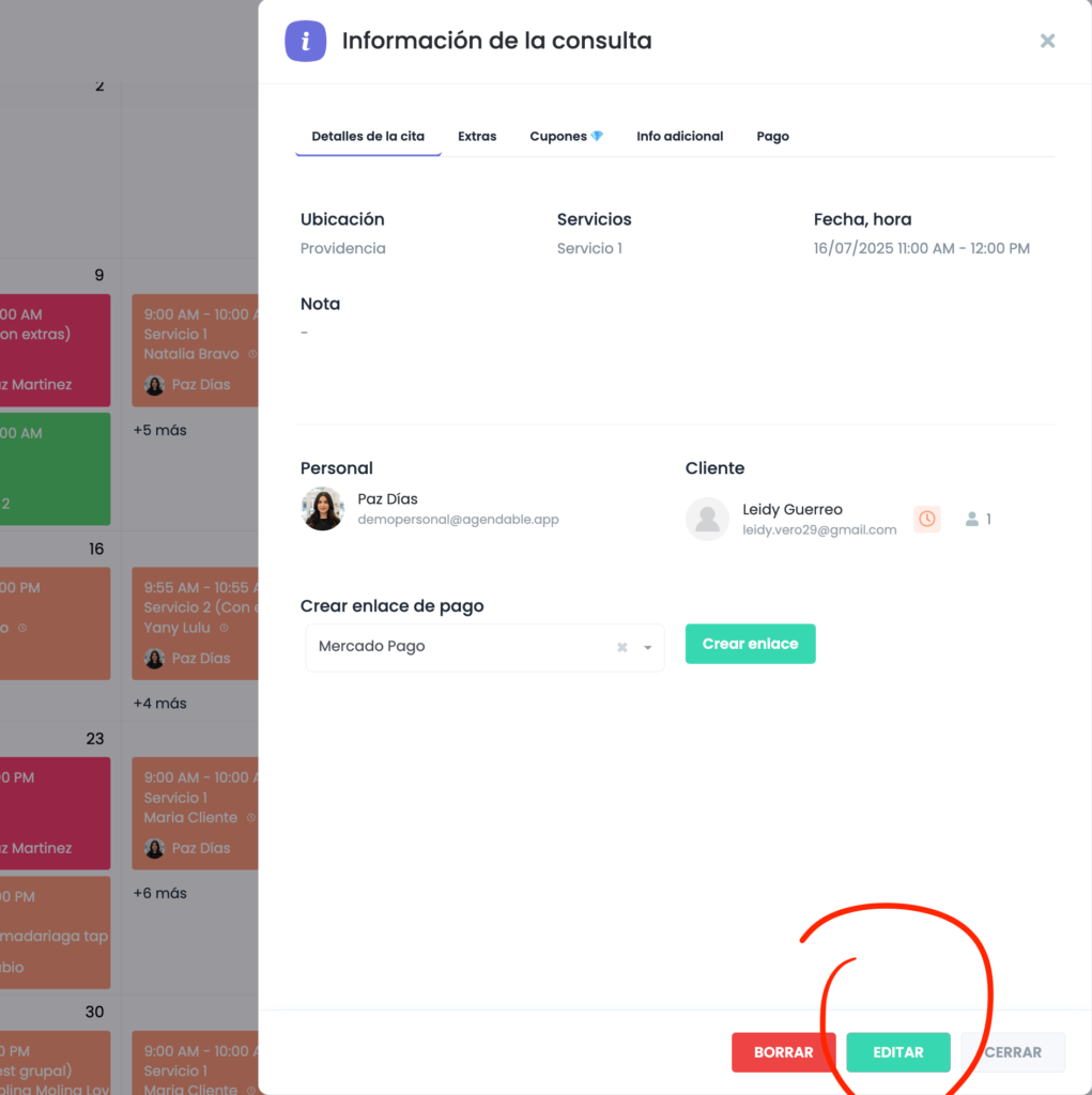 - Editar una cita: Haz clic sobre una cita existente en el calendario, selecciona el botón "Editar" justo abajo y modifica los detalles necesarios. Al actualizar, también se pueden disparar las notificaciones automáticas si la opción de flujos de trabajo está encendida.