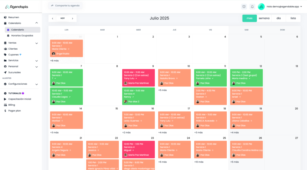 El módulo calendario de Agendapia ofrece una vista centralizada de toda tu actividad, permitiendo un seguimiento fluido tanto para administradores como para el personal.