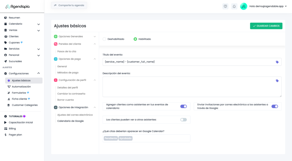 - Agregar clientes como asistentes en tus eventos de calendario:Activado