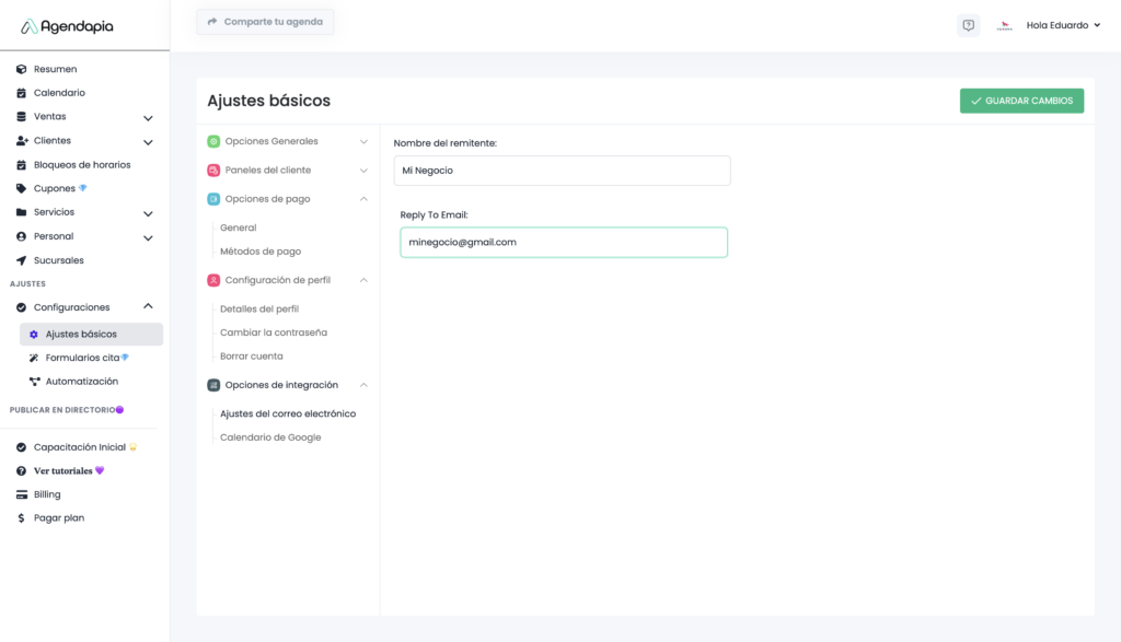 Configuraciones → Ajustes Básicos → Opciones de integración → Ajustes del correo electrónico