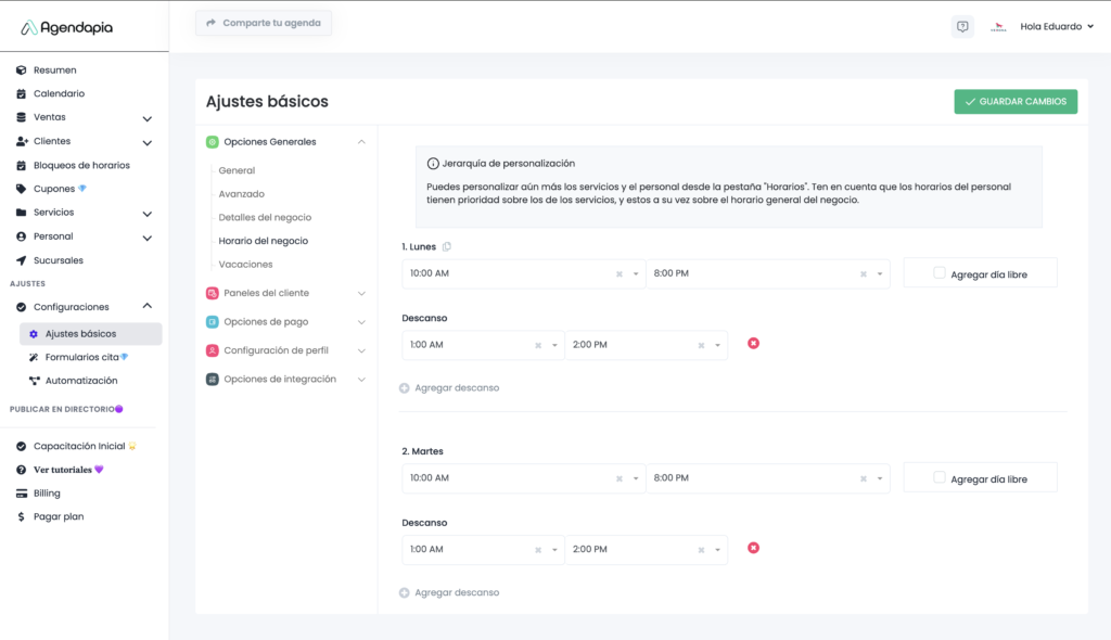 - Ajusta horarios especiales desde Servicios o Personal solo si es necesario.