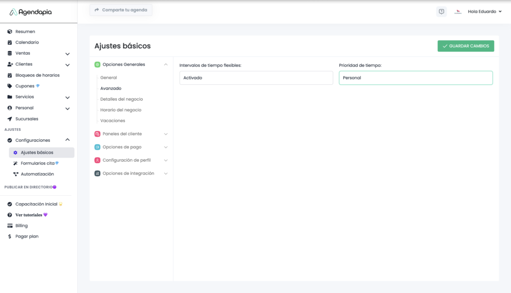 Estas opciones ayudan a que la agenda funcione correctamente cuando tienes servicios con distintas duraciones o personas con horarios diferentes.