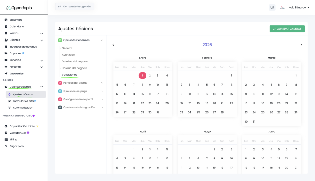 Configuraciones → Ajustes Básicos → Vacaciones → Seleccionar el día que dejarás como vacaciones y Guarda los cambios.